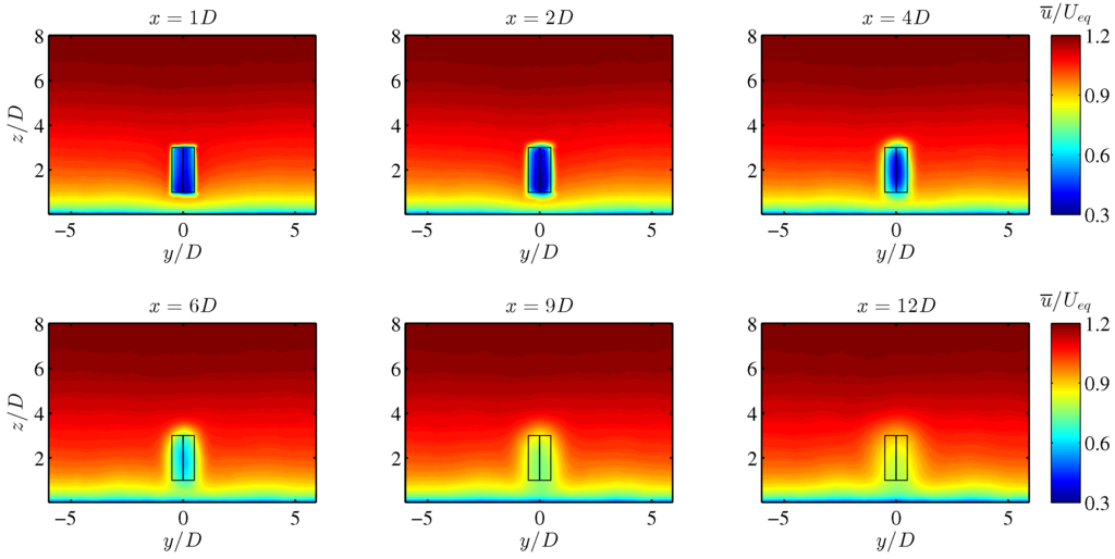 Contour plots of the normalized mean streamwise velocity () in six different y-z planes at different distances downstream of the center of the turbine.