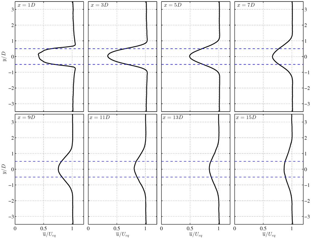 To have a more quantitative and precise insight about the VAWT wake, Figure 9 and Figure 10 can be consulted. Figure 9 shows spanwise profiles of the mean streamwise velocity in a horizontal plane at the equator height of the turbine in eight downstream positions. Besides, Figure 10 presents vertical profiles of the mean streamwise velocity in the x-z mid-plane of the turbine at different downstream positions. An interesting observation that can be made from Figure 6, Figure 9 and Figure 10 is that the maximum velocity deficit occurs at a downstream distance of about 2.7 rotor diameters; this distance is significantly larger than the equivalent one for the case of HAWT wakes [23]. After the point where the maximum velocity deficit (more than 65% of in this case) occurs has been reached, the wake starts to recover with a relatively high recovery rate (defined here as the magnitude of the rate of change of the maximum velocity deficit with streamwise distance). As we go farther downstream, the rate of the wake recovery decreases considerably; so that in the distances as large as 17 rotor diameters, where the velocity deficit reaches values of about 90%, the recovery rate is comparably very small.