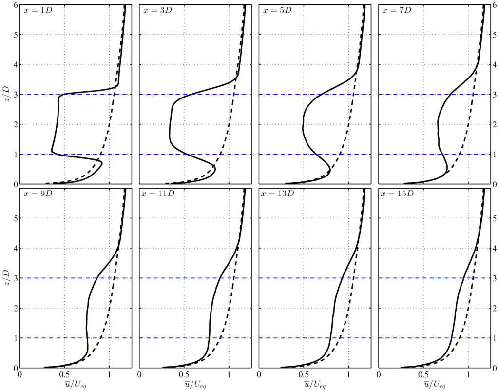 Vertical profiles of the normalized mean streamwise velocity () in the x-z plane going through the center of the turbine at different downstream positions. The black dashed line represents the inflow profile, and the blue horizontal dashed lines show the extent of the turbine.