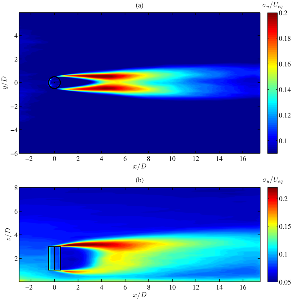 Contour plots of the streamwise turbulence intensity, : (a) in the x-y plane at the equator height of the turbine; (b) in the x-z plane going through the center of the turbine.