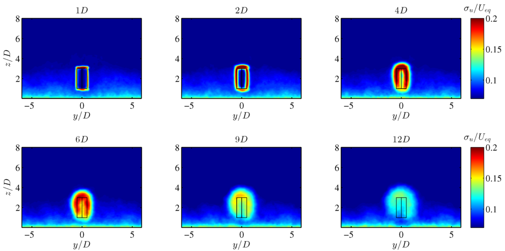Contour plots of the streamwise turbulence intensity, , in six different y-z planes at different distances downstream of the center of the turbine.