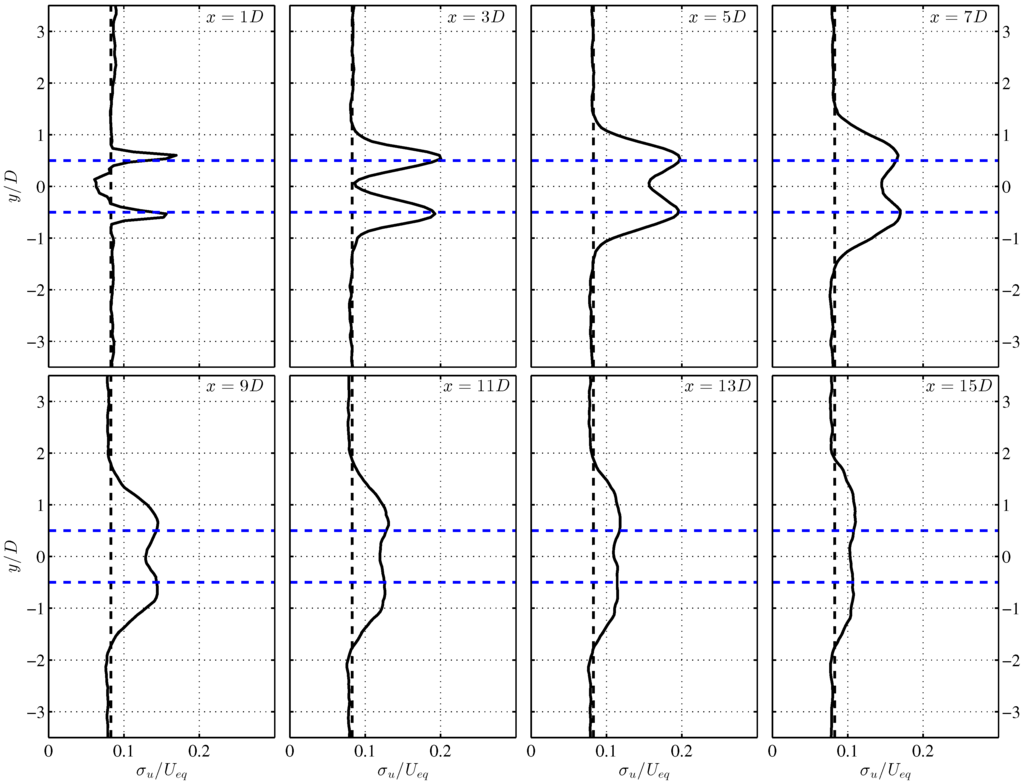 Another group of crucial quantities that has a significant importance in characterizing turbine wakes is the turbulence-related statistics, such as turbulence intensity and turbulent fluxes. These quantities are especially important for the design of wind farms, due to their role in both wake recovery and mechanical loads on turbine blades. Figure 11 shows contours of turbulence intensity (TI) in two different orthogonal planes (x-y and x-z) in the wake of the turbine. Here, the turbulence intensity is defined as . In addition, Figure 12 shows the distribution of TI in y-z planes at different downstream locations. In Figure 11a, it can be seen that two branches of high TI regions start to develop from the two spanwise extremities of the rotor swept surface (the black circle in the figure). These two branches grow in spanwise width as we go further downstream, until the point where they meet each other (for this case, in about 3.5 rotor diameters downstream of the turbine in the horizontal mid-plane of the turbine). Starting from the turbine area, the TI in each of these branches increases, until a point where the maximum TI occurs (about 3.8 rotor diameters downstream in this case); after this maximum point, the TI starts to decrease as the flow advances downstream, while the width of the branches continues to expand. Figure 13 examines the previous figure quantitatively, by showing the spanwise profiles of the TI in the equator height of the turbine. One can readily see that at each downstream position, the horizontal TI profiles have two maxima at two spanwise positions, which correspond to the two aforementioned TI branches. Although slight asymmetries can still be seen in the TI values of the two branches, the lateral asymmetry is not significantly pronounced. It should be noted that the degree to which the VAWT wake is laterally asymmetric is influenced by parameters, such as , airfoil type and the Reynolds number in which the turbine is working.