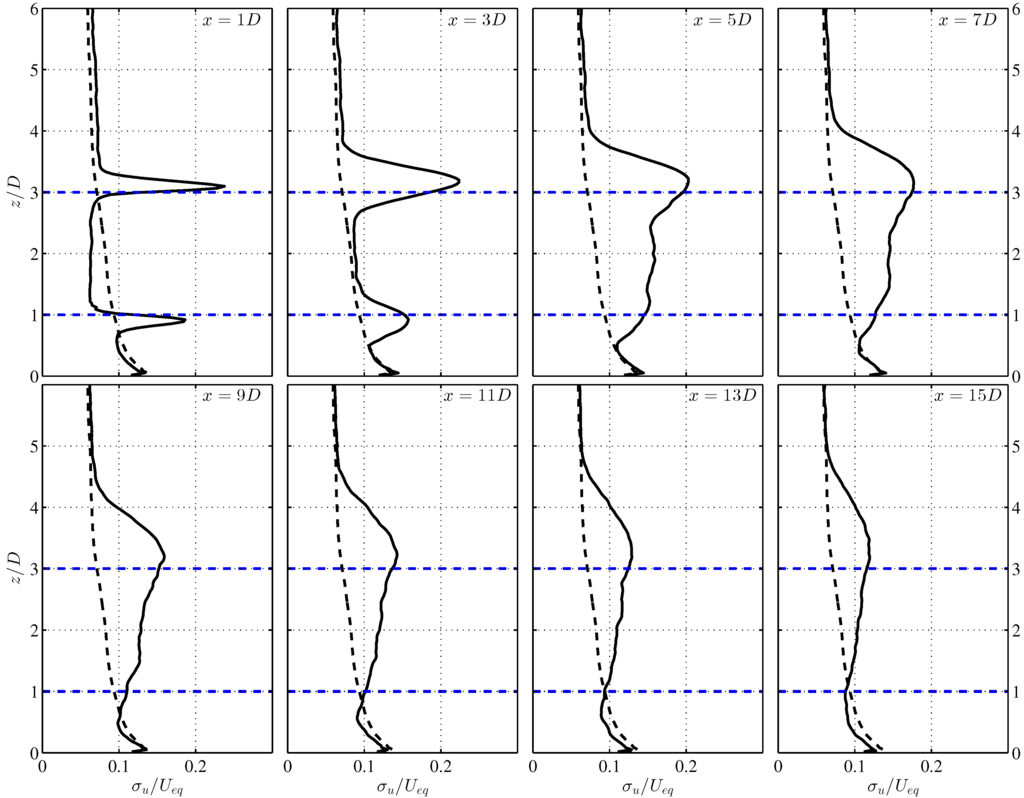 Vertical profiles of the streamwise turbulence intensity in the x-z plane going through the center of the turbine at different downstream positions. The black dashed line represents the inflow profile, and the blue horizontal dashed lines show the extent of the turbine.