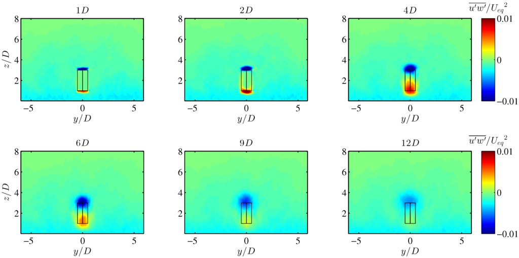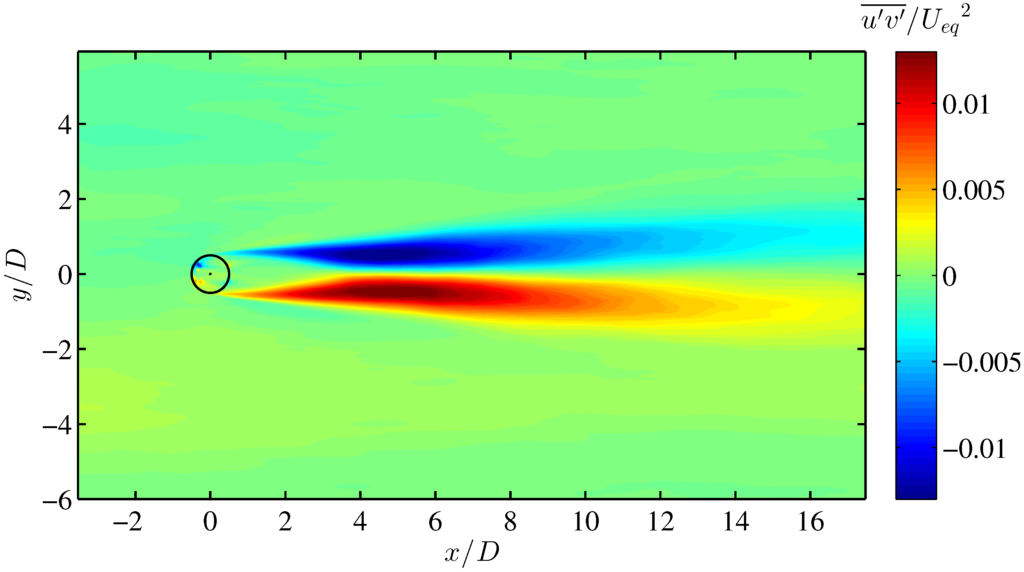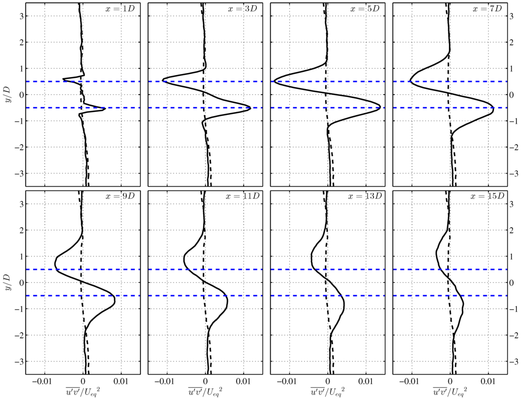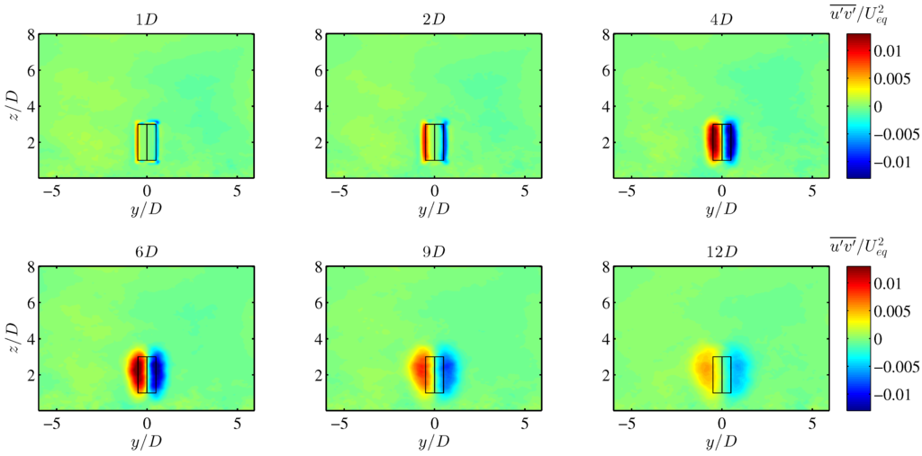 Furthermore, turbulent momentum fluxes in the VAWT wake are believed to be worthy of inspection, as they quantify the rate of flow entrainment into the wake, which is responsible for the recovery and lateral expansion of the wake. Figure 15 shows the normalized lateral turbulent flux () at the horizontal mid-plane of the turbine. The positive and negative regions of , which are located on the two lateral edges of the wake, show an inward entrainment of momentum into the wake region. This lateral entrainment can also be seen in the y-z planes in Figure 16. Figure 17 shows the spanwise profiles of at the equator height of the turbine at different downstream distances from the turbine. We notice that for this case, the maximum absolute value of at the equator height of the turbine occurs between and ( for positive values and for negative values) downstream of the turbine, which is about farther downwind compared to the maximum TI point. It should be noted that, again in this figure, only a slight lateral asymmetry (in terms of ) can be observed.