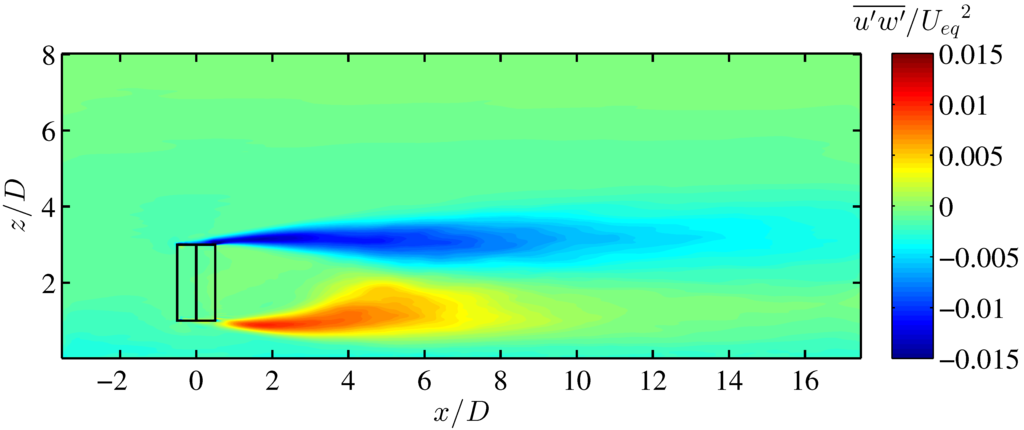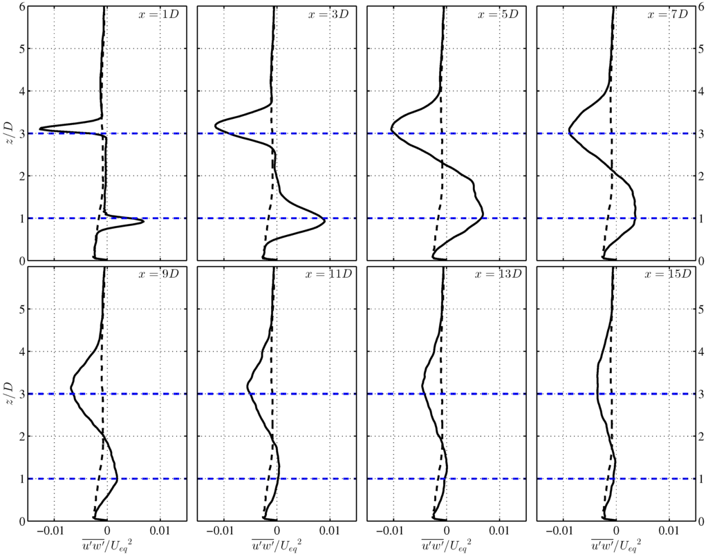 Figure 18 and Figure 19 show the normalized vertical turbulent flux () in the wake flow. The vertical inward entrainment from both above and below the wake region is clear in these figures. Figure 20 displays the vertical profiles of in the x-z plane going through the center of the turbine. It can be seen in this figure that the values of the vertical turbulent flux are higher in upper edge of the wake with respect to the lower edge. Here, we can observe that the magnitude of (in the aforesaid vertical plane) peaks relatively close to the turbine ( for positive values and for negative values) at heights near to the ones of the upper and lower edges of the blades.