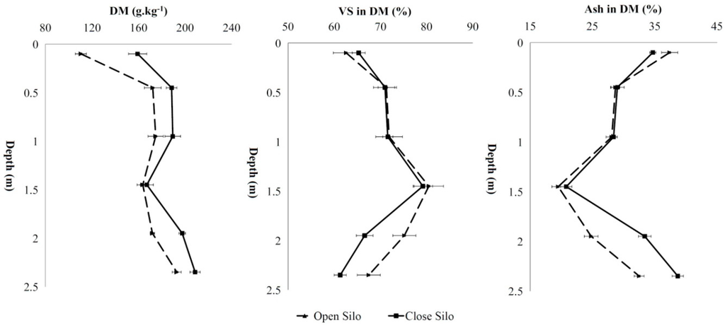 The BMP results, VFAs, lactic acid and ethanol content in VS throughout the silos showed that there was practically the same trend in ethanol and the BMP of samples from both open and closed silos. For instance, in the top layer of the open silos, the ethanol content and BMP were lowest. CH4 and biogas production from samples taken from the middle part of the silos was highest.