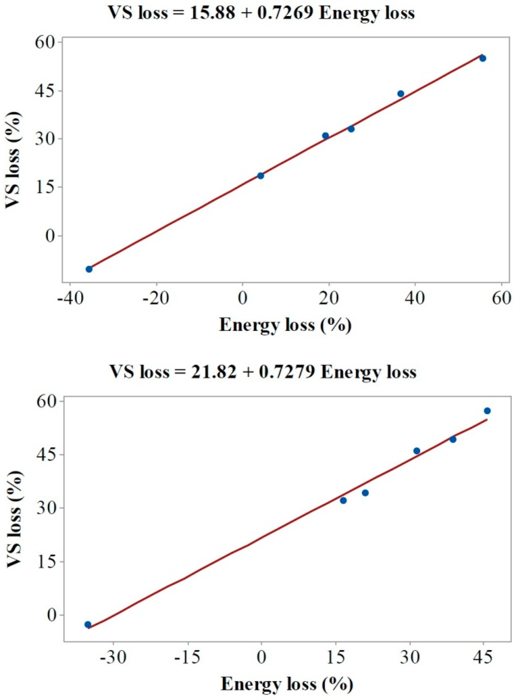 In order to evaluate the efficiency of silage, it is important that methane yield should be calculated based on original VS. Due to VS and ash stratification, the calculated original methane yields differed at each depth. Original methane yields showed that for all samples except from the depth of 1.45 m, methane yields were lower than those of fresh sugar beet pulp at 342 (±5) NL CH4/kg VS. These results showed that ensiling of sugar beet pulp in this study in most cases led to a decrease in methane yield. Energy losses had the same trend as VS losses in both silos, which were highest at the surface and at the bottom of the silos. As with the VS losses, the calculated energy loss of samples from a depth of 1.45 m was negative, expressing an increase in energy content. Generally, energy losses were lower than VS losses at all depths of the open and closed silos. VS losses are depicted versus energy losses in Figure 2 with a related linear equation between them. For the open silo, a loss of up to 16% of VS resulted in no energy loss, whereas in the closed silo this figure rose to up to 22% due to the better silage conditions in the closed silo. On the other hand, the slopes of the lines for open and closed silos were 0.7269 and 0.7279 respectively. The slope of the line might be dependent on the type of feed used in silage, so given that sugar beet pulp was used for silage in both silos the line slopes are very similar.