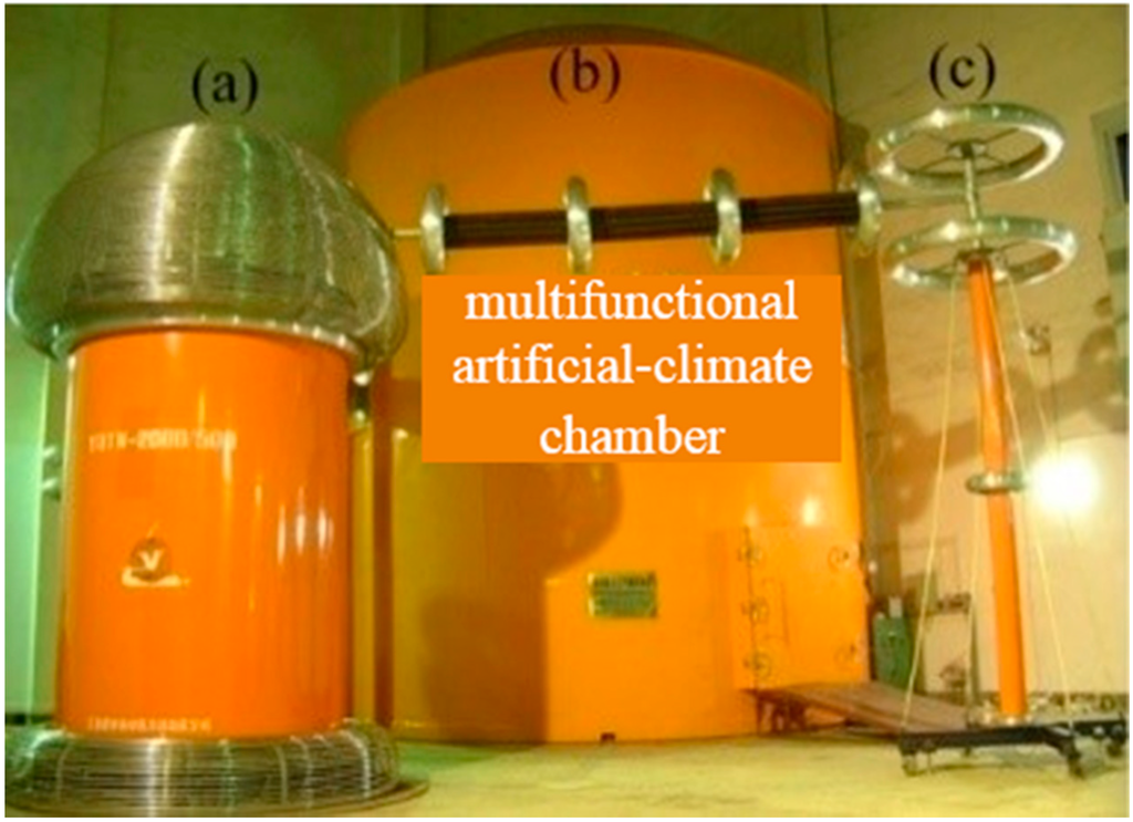 Experimental facilities (a) 500 kV/2000 kVA testing transformer; (b) multifunctional artificial-climate chamber; (c) 500 kV capacitive voltage divider.