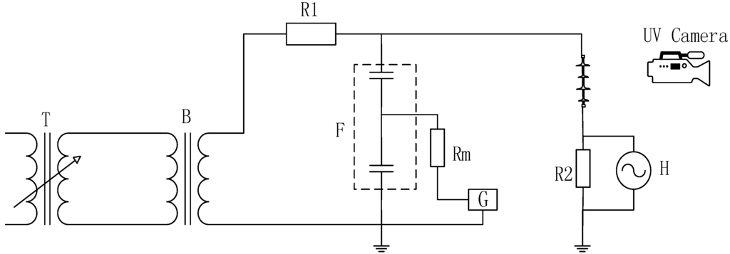 Schematic of the test circuit. T: 10 kV voltage regulator; B: testing AC transformer; R1, Rm: protective resistance; F: AC capacitive voltage divider (10,000:1); R2: detection impedance; H: oscilloscope.