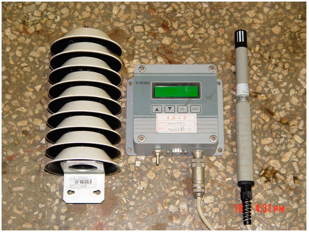 The atmospheric pressure (p), temperature (T) and relative humidity (RH) in the experiments were measured with a PTU2000 device (VAISALA, Helsinki, Finland) as shown in Figure 4. At 20 °C, the temperature measurement error is ±0.2 °C, and the relative humidity error is ±1%.
