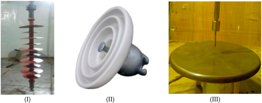 The experimental specimens were FXBW-35/70 composite insulators (I) (HONGGUANG, Leqing, China), XP-70 porcelain insulators (II) (HAOTIANTONG, Hejian, China), and a needle-plane model (III) (Chongqing University, Chongqing, China), as shown in Figure 5. The basic technical parameters of the insulators are shown in Table 2. The curvature radius of the needle-plane model tip is 0.1 mm, the plane electrode diameter is 60 mm (made of brass plate), and the air gap of .needle-plane model is 15 mm.