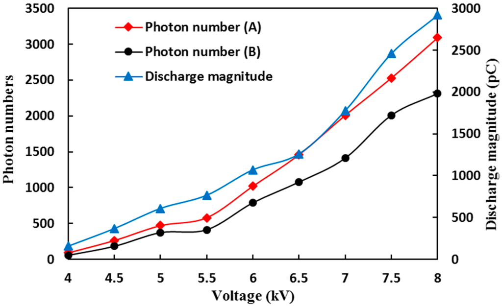 Test results of photon numbers and discharge magnitude (p = 97.98 kPa; T = 20.3 °C; RH = 62.7%).