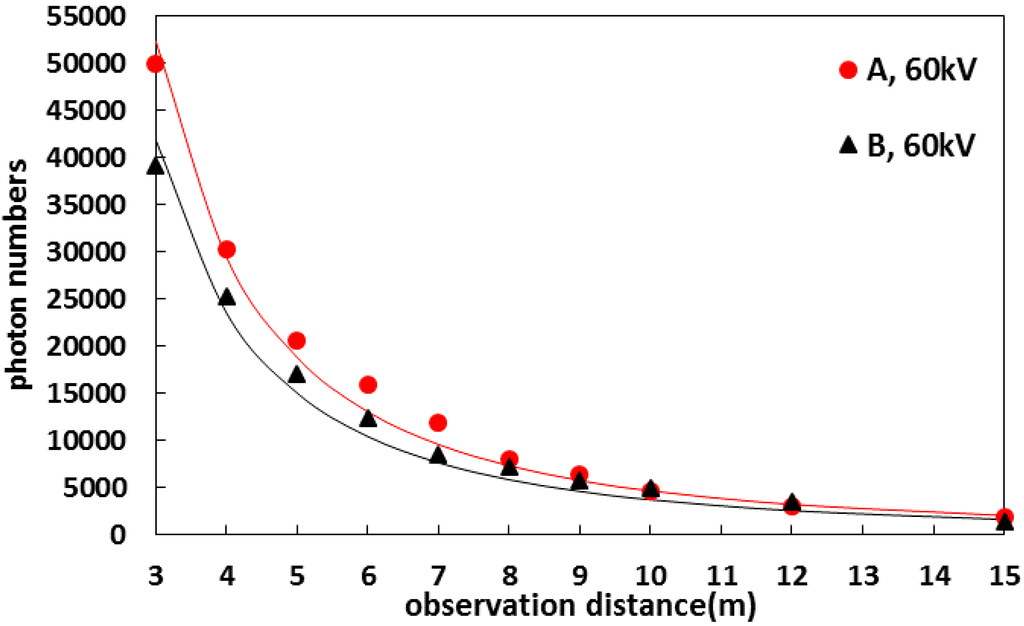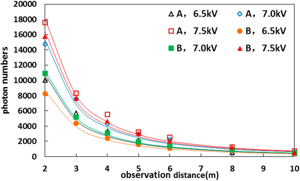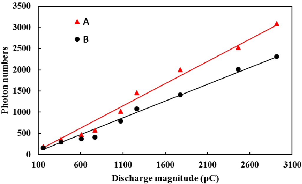 - The photon numbers of discharge detection decrease with the increase in the square of observation distance. The distance from the sample should be measured and corrected to the contrast distance in accordance with the correction method in this study after discharge detection.
