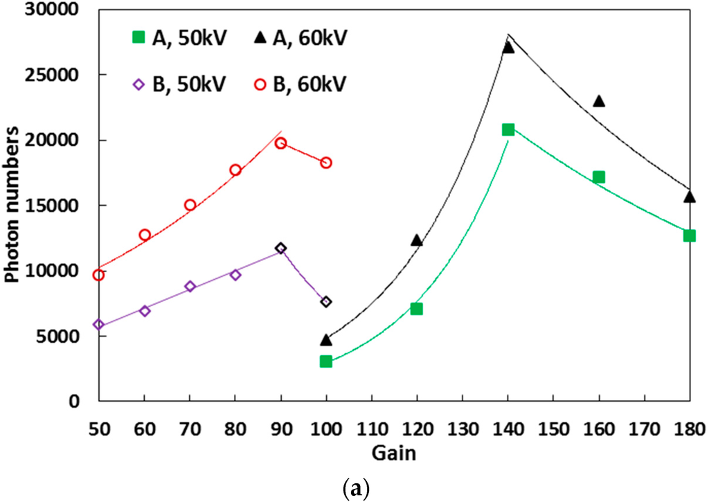 Figure 8 and Figure 9 also indicate that the variation trend of photon numbers with gain can be approximately expressed as an exponential function in increasing and decreasing intervals. However, owing to the large amount of outside interference, the quality of imaging from Type B is poor and unstable when the imager gain is greater than 90. Thus, the results under the gain of Type B over 90 are not recommended, and the variation trend of photon numbers with gain is irrespective when the gain is greater than 90. The test results were fitted according to Equation (1). The fitting results are shown in Table 4 where R2 is the square of fitting coefficients: