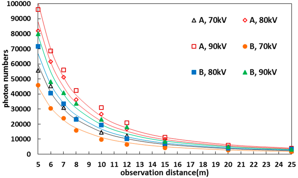 In Table 5, the fitting degree R2 of each sample at different voltages is close to 1. The relationship between observation distance and photon number satisfies Equation (8). Thus, the measurement results of different distances should be corrected.