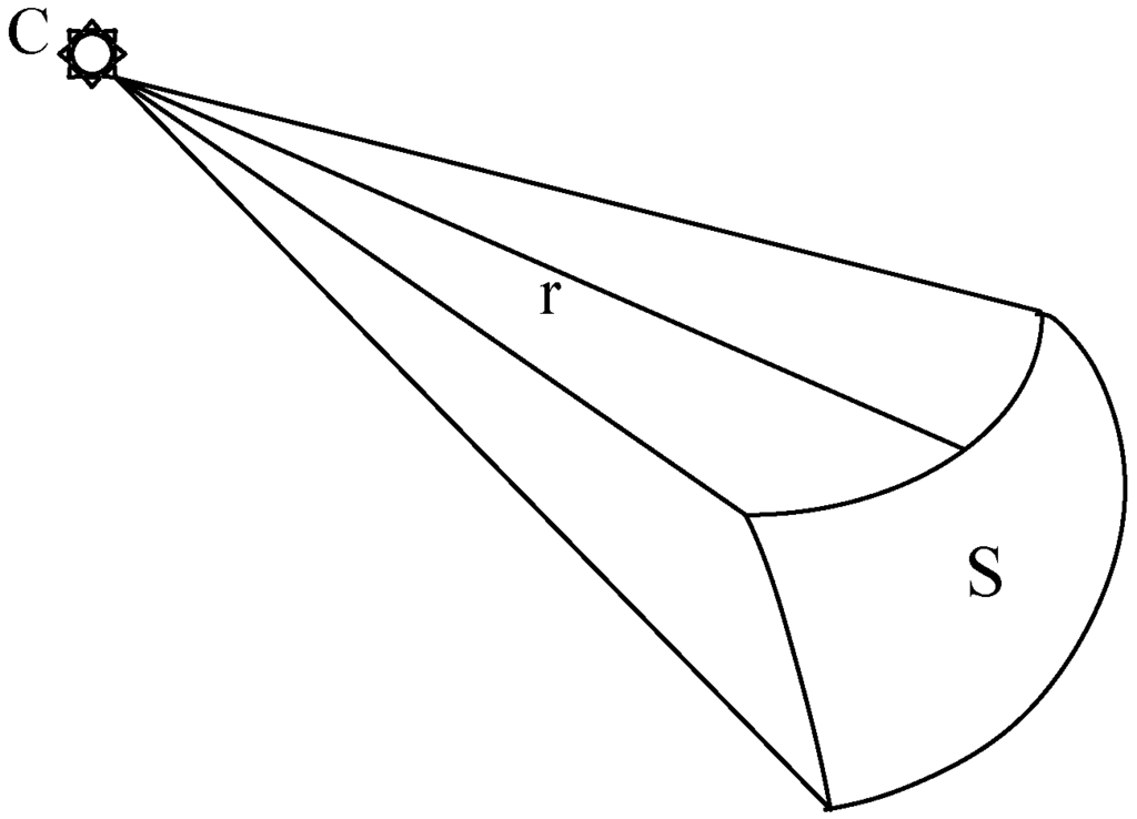 The irradiation intensity of C is Q, the luminous flux surface density of S from C is ρ, and the light intensity of S is L. ρ and L can be expressed as follows: