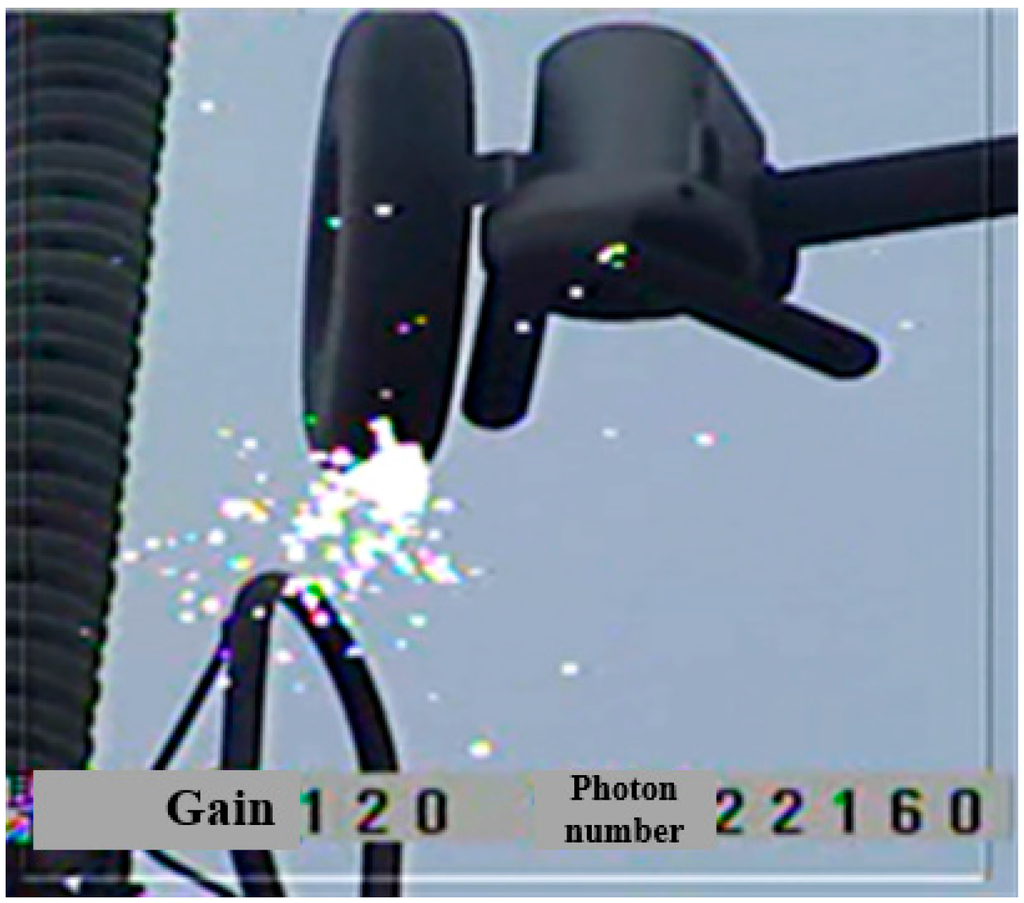 As an important quantitative parameter in detecting corona discharges by UV imaging, photon number has been widely utilized in both laboratory research and field tests. In detection, photon number can rapidly, directly, and conveniently reflect partial discharge. However, in practical applications, this parameter still has some deficiencies because of its complex relations with observation angle, imager gain, observation distance, and imager types. To overcome these problem, several scholars have attempted to quantify discharges by UV image processing [18,19,20]. However, more unified conclusions are required. Owing to the fact the observation angle, observation distance, imager gain, and imager types are different in detection and comparisons of the photon numbers of different detections is lacking, discharges cannot be accurately quantified. Therefore, the effects of factors, such as imager gain and observation distance, on photon number detection should be evaluated.