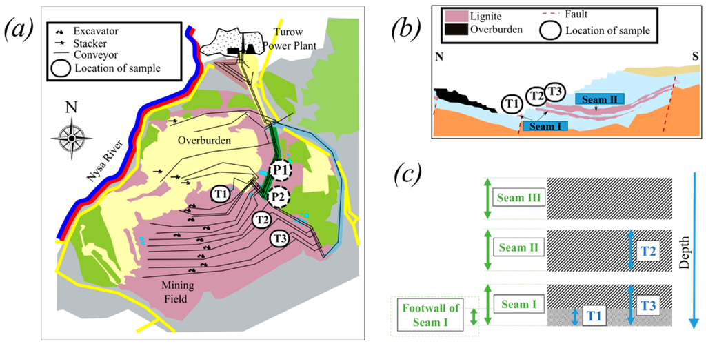 (a) Overview of Turow mine; (b) profile of the mine; and (c) scheme of sample location [20].