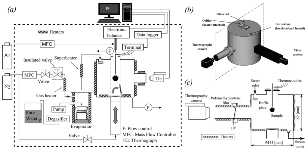 After the preparation, the sample was set in the test section, where lignite was dried in a superheated steam atmosphere. Figure 4a shows the configuration of the experimental apparatus. The cylindrical test section, of which the diameter is 133 mm and the height is 152 mm, was operated with heaters providing the uniform temperature in the testing zone. The heaters were located on the bottom of the test section, around the outer wall and on the cover of the test section. Pure water was degassed, pumped up by a liquid delivery pump and provided to an evaporator and then a superheater. The superheated steam was sent into the top of the test section, to which a baffle plate was attached to disperse the supplied steam into the entire test section, and exhausted from the bottom by a fan. The sample weight, its surface and interior temperatures (both center and midpoint) were measured for the observation and discussion of the drying characteristics. The weight was measured with an electronic balance having a resolution of 0.1 mg. The electronic balance was connected with a metal suspension wire, on which the glass rod with the sample was hanged. The suspension wire was surrounded by a protective acryl pipe. Air was supplied into the acryl pipe attached under the electronic balance at the rate of 0.6 dm3·min−1, in order to stabilize the temperature and flow inside the pipe and ensure accurate weight measurement.