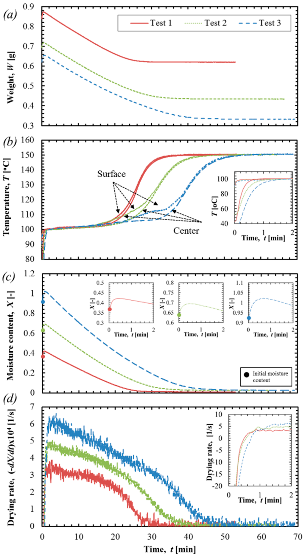 Exemplary drying characteristics of Sample T1 in superheated steam: 10 mm sample used in test temperature at 150 °C, change in: (a) weight; (b) temperature profiles; (c) moisture content; and (d) drying rate.