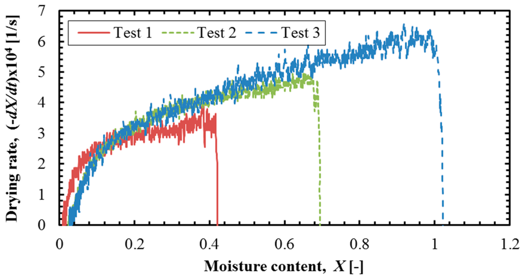 As it is well known that the heat input to the sample is consumed for the evaporation of water in the CDRP since the change in the temperature profile does not occur, the initial drying rate of the test can be thermodynamically derived. As the thermodynamic evaluation has been previously carried out and verified for lignite from the Belchatow deposit, the initial drying rate (the drying rate at the CDRP) (s−1) can be derived from the following equation [18]: