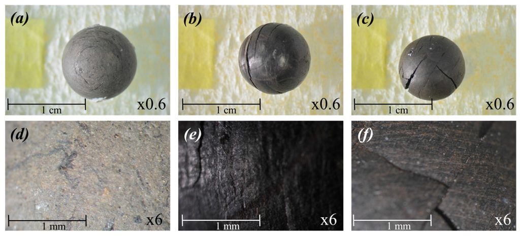 Thus, the drying process is completed sooner than other tests (Table 3). With Tests 2 and 3, the increase of the center temperature is gradual to that of the surface temperature in the transition from the saturation temperature to the test temperature. In Test 1, the rise of temperature at the sample center is rapid due to lower moisture content, and small temperature gradient is observed over any other instance on the transition from the saturation temperature to the test temperature. The sample with low moisture content has a heavier weight, so that the change in the weight caused by the water evaporation is quantitatively small to the weight of the dried sample. Thus, moisture content becomes smaller in the sample and it leads to the lower drying rate. This also influences the appearance of the sample, as it was shown in Figure 7. The initial and final states of all the samples in the superheated steam drying process are indicated. The white dot circle in the pictures is the outline of the initial shape of the samples. The values of moisture content at initial and final states are also indicated. When comparing the physical appearance at the final state to that of the initial state, the size of the sample becomes smaller. This can be seen in all the represented cases. Pores, in which water is kept in the sample, become vacant after the water removal and they are crushed due to thermal stress mostly in the DDRP at which the sample’s surface and core temperatures start increasing from the saturation temperature to the test temperature. This behavior was previously shown [18]. The water transported from the inside sample to the shell at the CDRP might occur not as vapor, but in the form of liquid. This allows for keeping homogenous temperature distribution inside the sample. Crushing of pores is not dominant phenomena in the CDRP. As a consequence of the water removal, the sample shrinks in all the cases. The volume shrinkage at the final state was estimated; 7.7% in Test 1, 18.3% in Test 2 and 40.7% in Test 3. The degree of shrinkage on Test 3, which has highest initial water of 47.9%, is visibly more remarkable than that of Test 1, which has lowest initial water of 26.8%. High moisture content sample possesses large numbers of pores to keep that amount of water inside. Thus, the dried sample becomes significantly smaller, comparing to the initial size. In the case of the lower moisture content sample (Test 1), the shrinkage of the sample is not alike the rest of tests (Tests 2 and 3), this may be connected with ash content in the sample. The surface color of the Test 1 sample is very bright and rather grey color compared to the others (Figure 8a,d). Considering the proximate analysis, the color is resulted from the large ash content, in which silica and alumina oxides dominate over 85% of the composition. The specific gravity of ash is larger than lignite (Table 2) and this results in the heavier weight of the sample. Looking at the Figure 8b,c, cracking on the sample surface is observed in both Tests 2 and 3. This cracking occurred primarily along the one certain direction of the sample in Test 2 (Figure 8e). In the meantime, the appearance of cracks in Test 3 is more frequent than in Test 2 and is on many directions (Figure 8f). A heavier weight sample in Test 1 does have less amount of water within itself, so significant cracking on its surface was not observed.