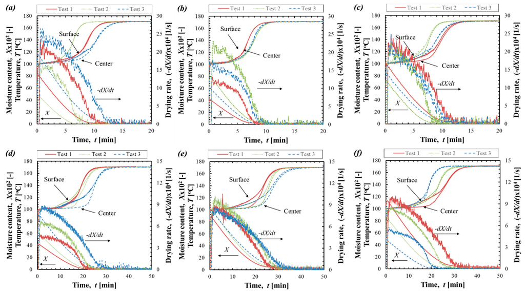 Exemplary drying behavior of lignite spherical sample at the test temperature of 170 °C: (a) T1 5 mm; (b) T2 5 mm; (c) T3 5 mm; (d) T1 10 mm; (e) T2 10 mm; and (f) T3 10 mm samples.