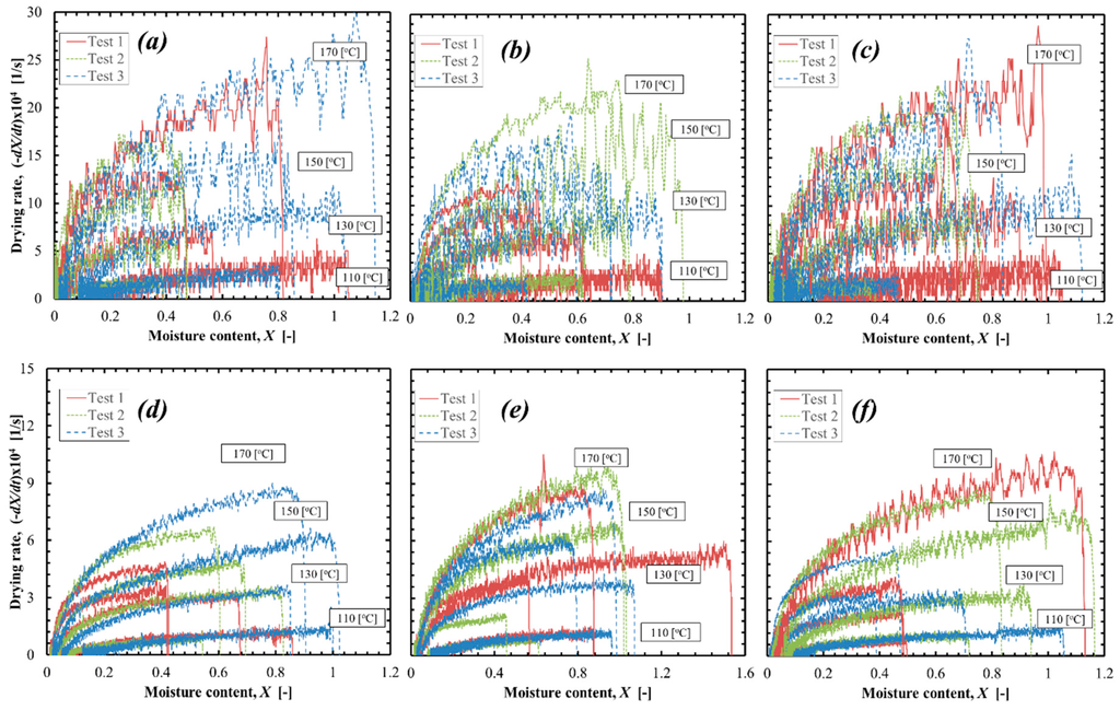 Drying rate curve plot for: (a) T1 5 mm; (b) T2 5 mm; (c) T3 5 mm; (d) T1 10 mm; (e) T2 10 mm; and (f) T3 10 mm samples.