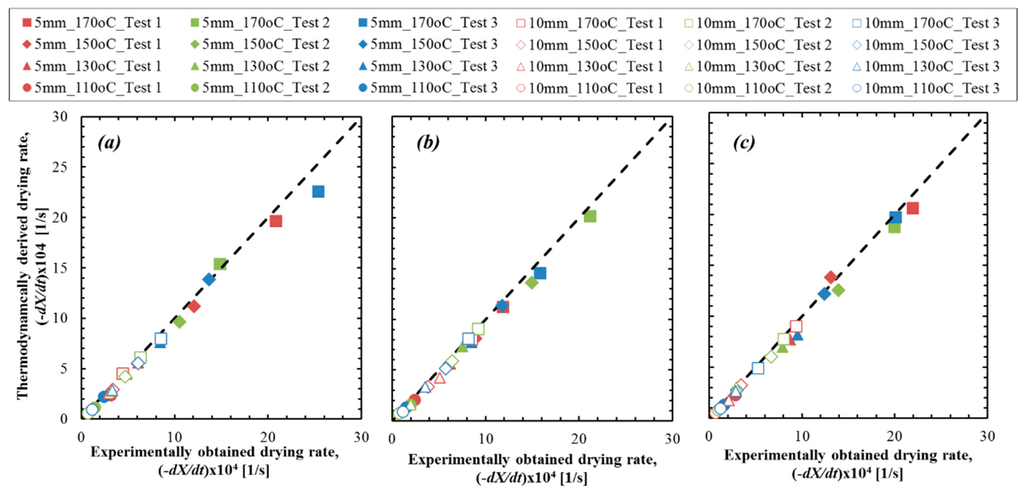 Comparison between the experimentally obtained drying rate and thermodynamically derived drying rate at the constant drying rate period (CDRP). The results for: (a) T1; (b) T2; and (c) T3 samples.