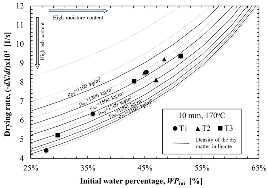 Figure 13 shows the correlation of the drying rate at the CDRP and WPini of the examined samples. The drying rate was also predicted with the given density of the dry matter in the lignite, using Equation (3). Plots on Figure 13 is the drying rate obtained from the drying test of 10 mm samples dried in 170 °C. The lowest drying rate is obtained with the sample that contains lowest WP and the highest density. This may be attributed to the higher composition of the ash in the sample. As a matter of the fact, the drying rate of highly contaminated T1 sample can be found in this profile. A higher density of dry matter, together with the decrease of WPini, lowers the drying rate at the CDRP. With the consideration that has been shown in Table 2 and the deliberation from Figure 12, high concentration of ash may be the most influential factor deciding the tendency of lowered drying rate. In this lignite sample, the loam and quartz sands sedimentations or inorganic matters originated in the detirius coal structure seems to be the cause.