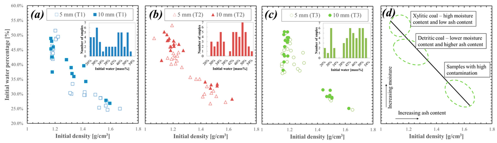 Figure 14 shows the correlation between the initial water and the density of raw sample before drying for T1, T2 and T3 samples. Histogram chart of WPini was presented together with the correlation for each sample. The WPini spreads very widely for whole range in the figure (from 25% to 55%) and this can be seen in all the presented samples T1, T2 and T3. Samples T1 and T3 are essentially from the same seam, so they have similarity with moisture among the group of relatively large amount of initial water (37.5%–51.5%) and of lower density of raw material (1.14–1.30 g·cm−3). Trend in Sample T3 distinguishes this group more clearly. The trend in Sample T1 is on the other hand rather blur and difficult to distinguish. It may be connected with the implication of contamination in the sample. Sample T3 also implies the footwall of the Seam I, this group may be seen in the other one of Figure 14c (plots gathering with small amount of WPini and high density tested samples).