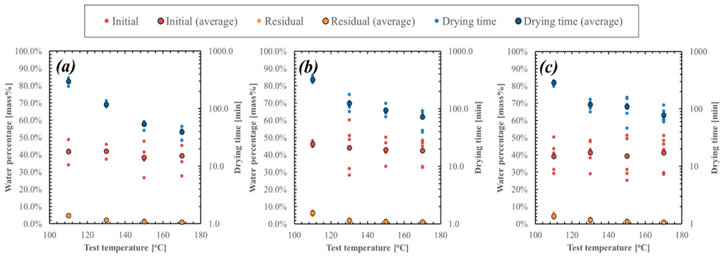 Initial and residual WPs and drying time for 10 mm particle made of Samples: (a) T1; (b) T2; and (c) T3.