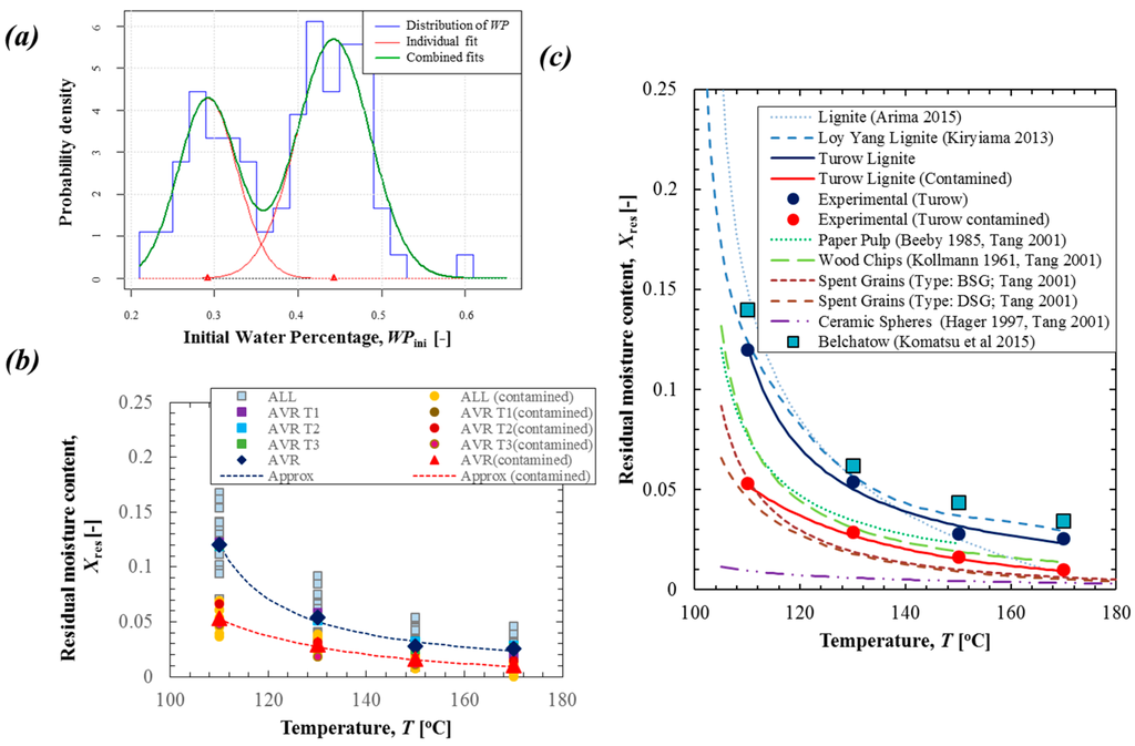 (a) Probability density of the distribution of the WPini of Turow lignite samples; (b) residual moisture content in Turow lignite; and (c) comparison of residual moisture content in various materials based on data from the literatures [9,16,18,27,28,29,30].