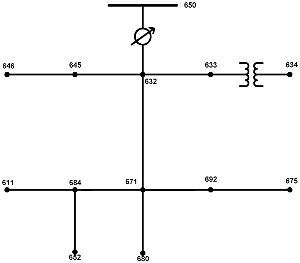 The original IEEE 13-node test system is shown in Figure 1. The source is a 115-kV line-to-line infinite bus. The relevant data for the test system are presented in Table 1 and Table 2 [48]. However, the original version of this test system is not sufficient to demonstrate the proposed methodology for the following reasons: