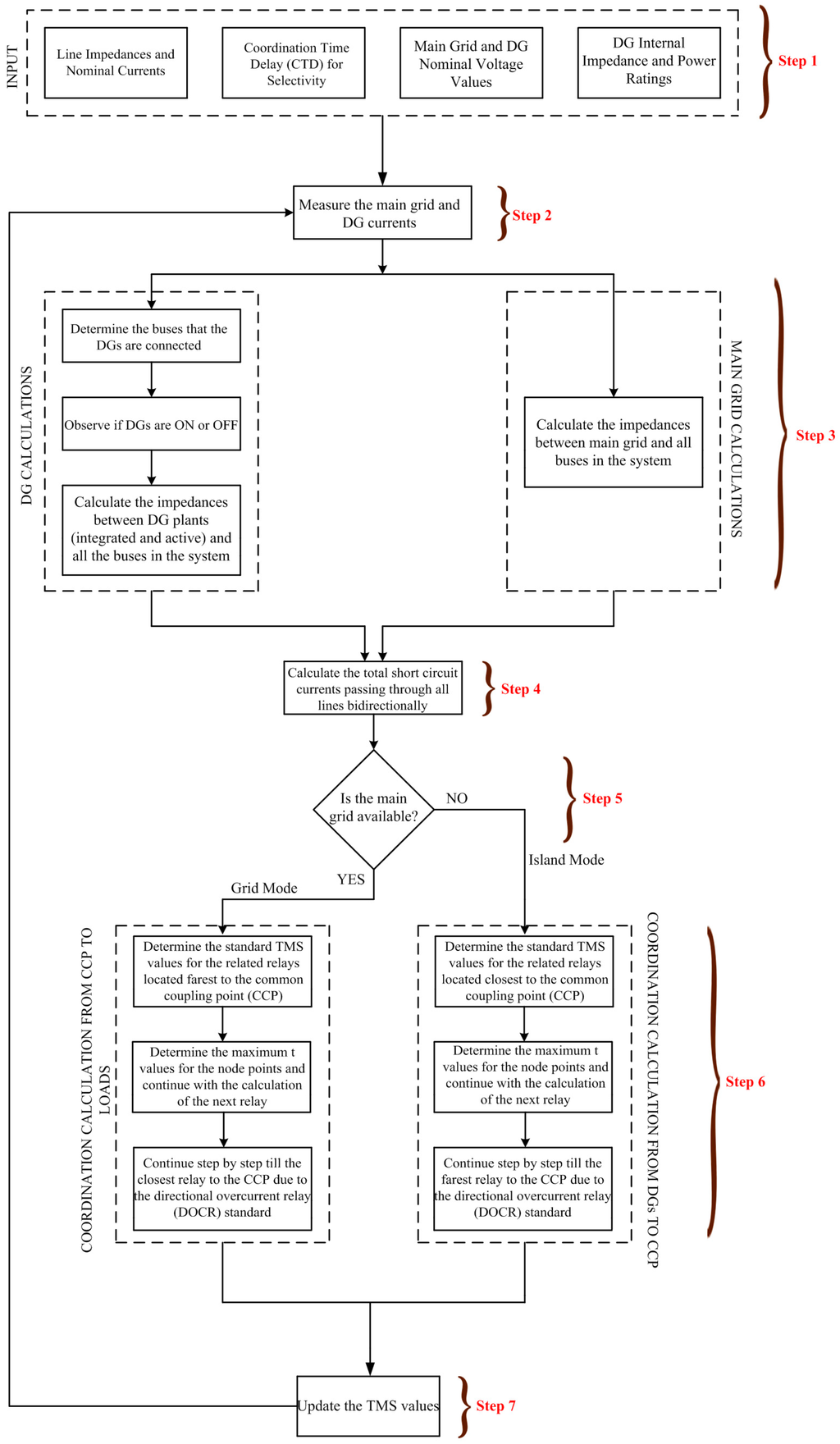 - The analysis of the fact of whether or not the main grid is available is realized in this step. If the main grid is available, then the adaptive relay coordination is realized for grid-connected mode. If not, the mentioned calculations are provided for islanded mode operation.