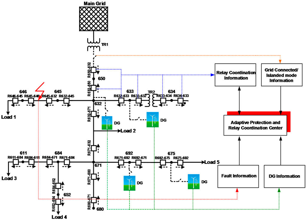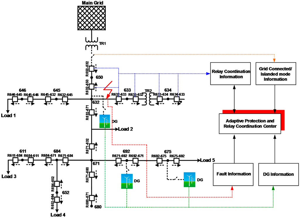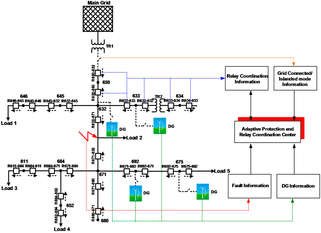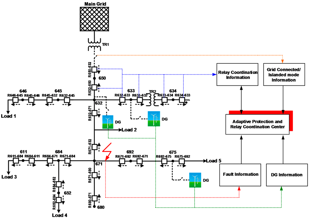 This section presents the results of the case studies based on the performance evaluation of the proposed adaptive protection scheme. The simulations are performed using the MATLAB/Simulink/SimPowerSystems environment (MathWorks, Natick, MA, USA).
