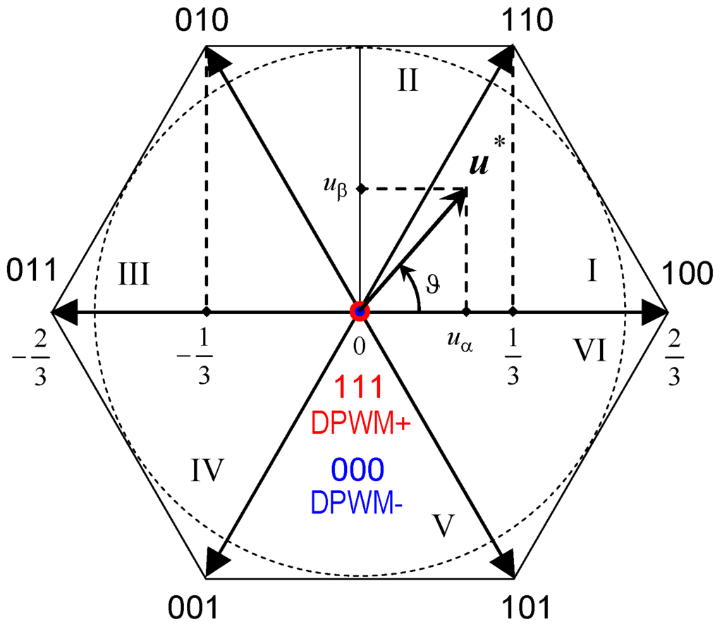 Considering the discontinuous PWM, there are two basic implementations: the so-called positive bus clamped (DPWM+) and the negative bus clamped (DPWM−). Namely, DPWM+ does not use the state 000, while DPWM− does not use the state 111, as shown in Figure 1. In terms of carrier-based modulation, the implementation is possible by a different common-mode signals injection [2,3].