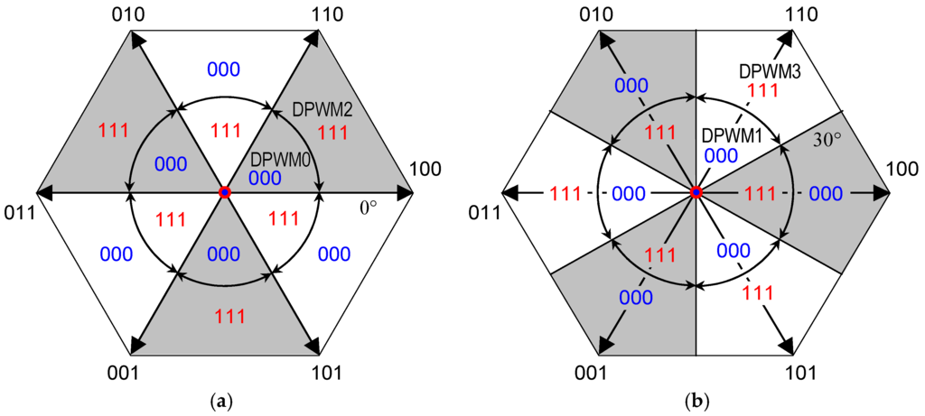 In order to balance the usage of the six inverter switches within the fundamental period, a suitable combination of positive and negative clamped DPWMs can be considered. In particular, DPWM0, DPWM1, DPWM2, and DPWM3 are obtained by alternating the DPWM+ and DPWM− every 60°, as represented by the grey colored sectors in Figure 2. In Figure 2a, DPWM0 and DPWM2 are depicted, starting at 0° with DPWM− and DPWM+, respectively, whereas in Figure 2b DPWM1 and DPWM3 are depicted, starting at 30° with DPWM−and DPWM+ respectively.