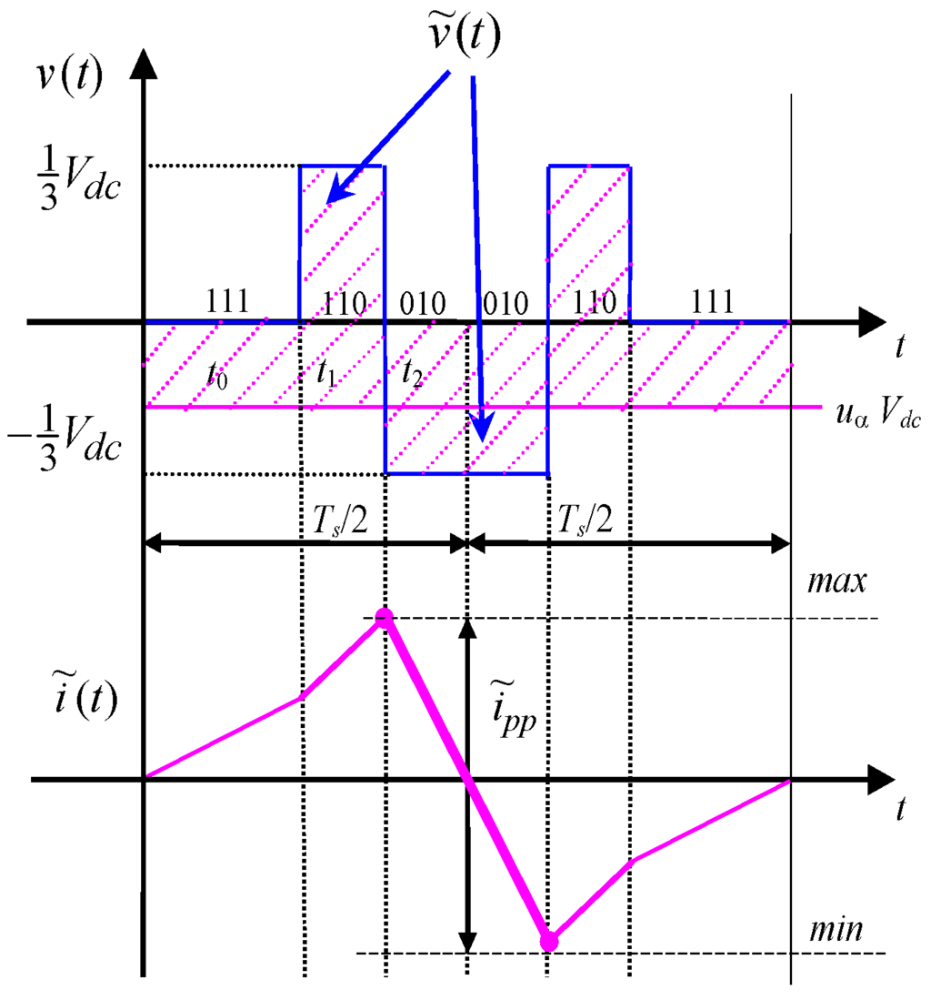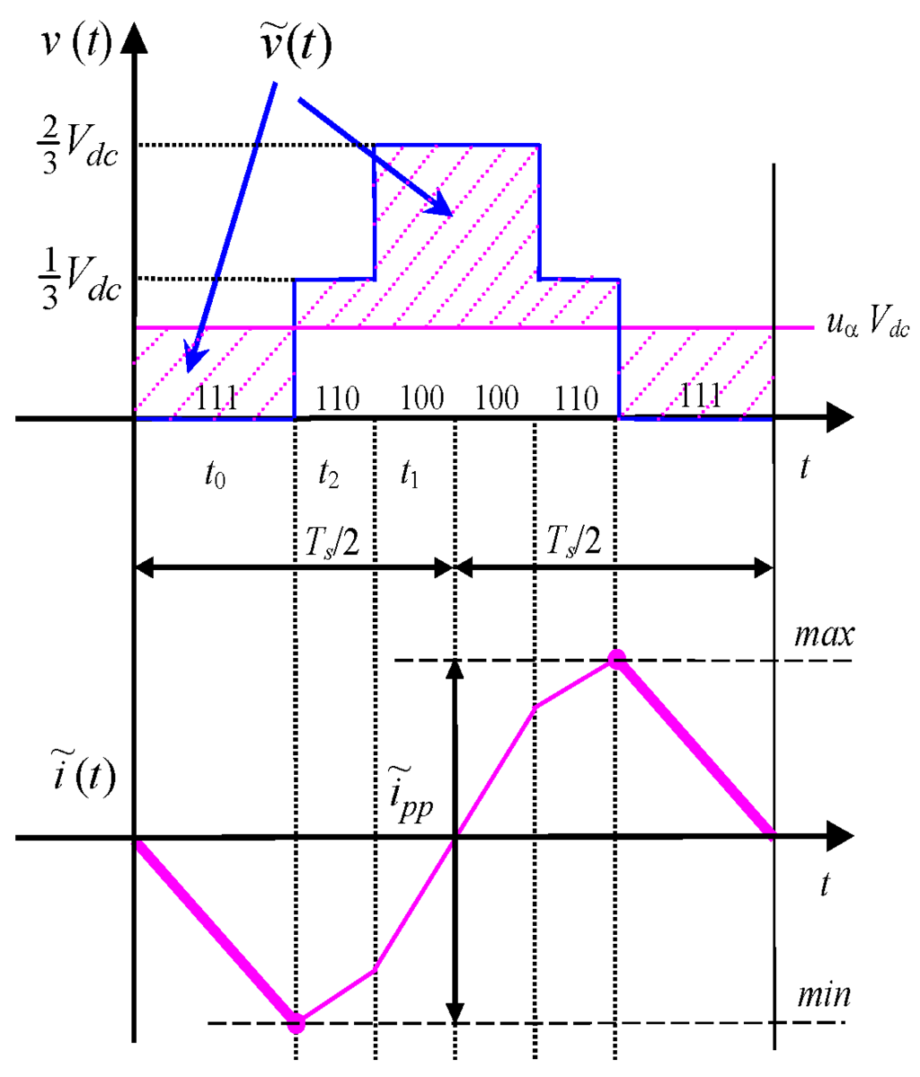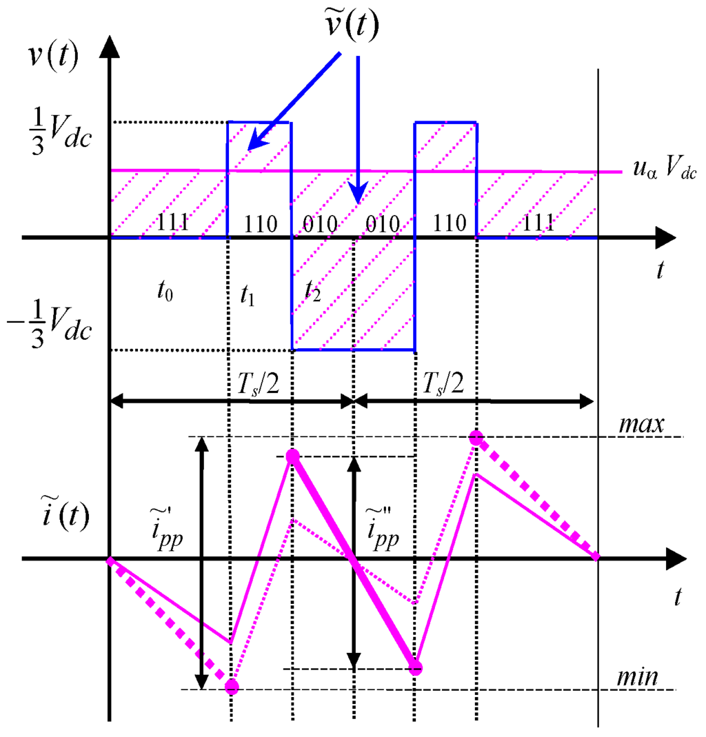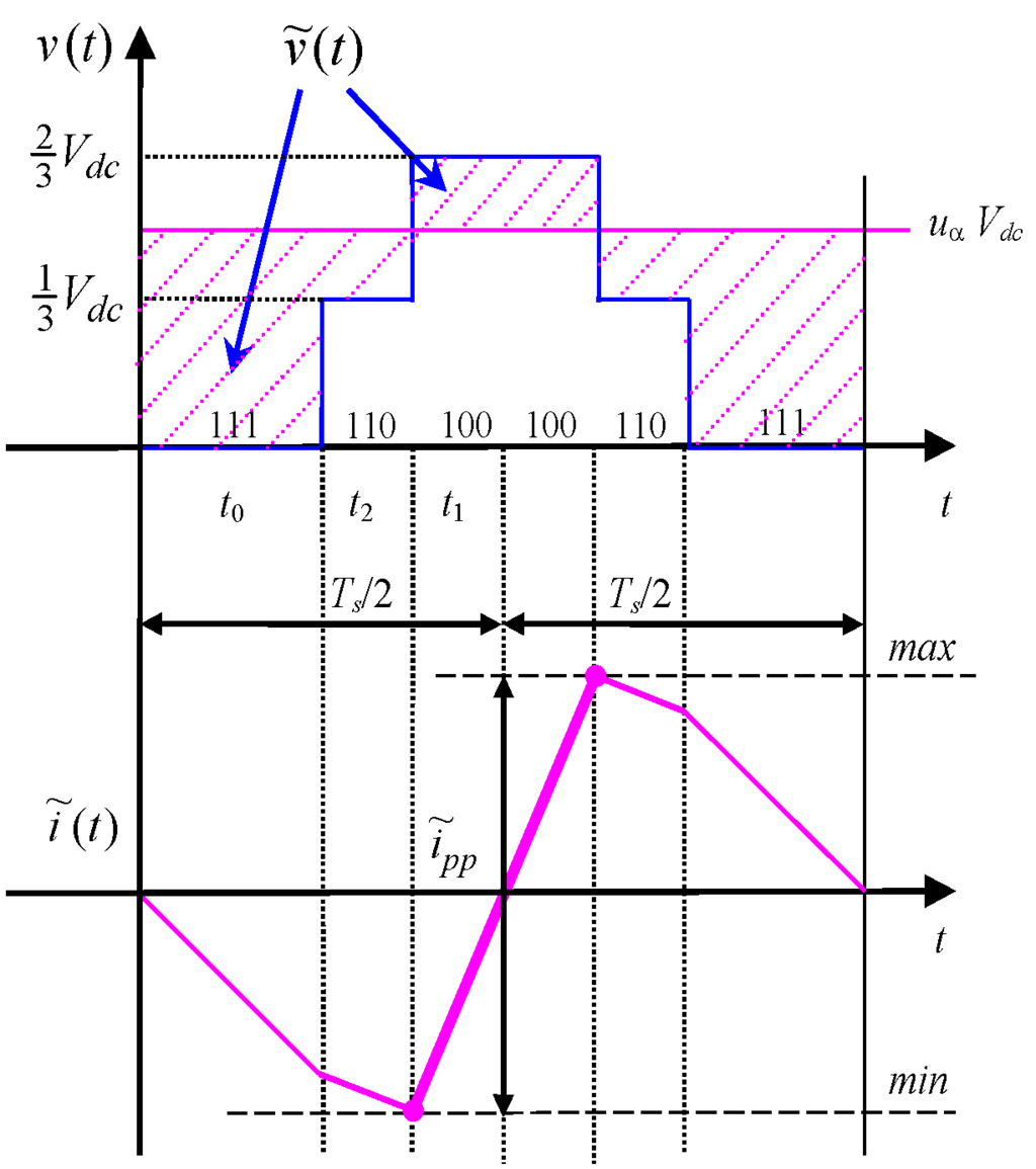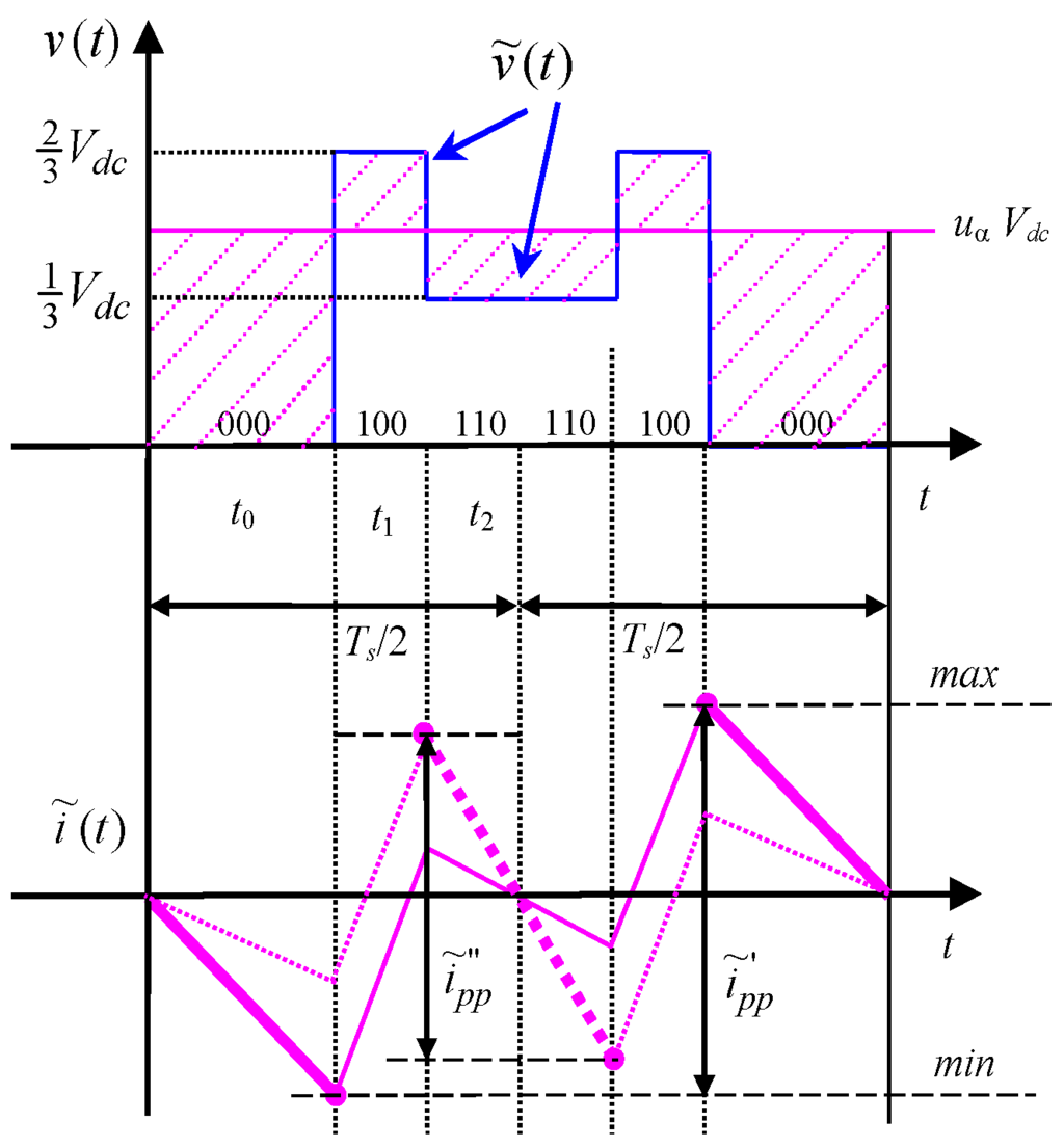 Considering a three-phase voltage source inverter either supplying an ac motor or connected to the grid by link inductors, the instantaneous current ripple can be determined for each phase according to [18,21], on the basis of the alternating voltage component :