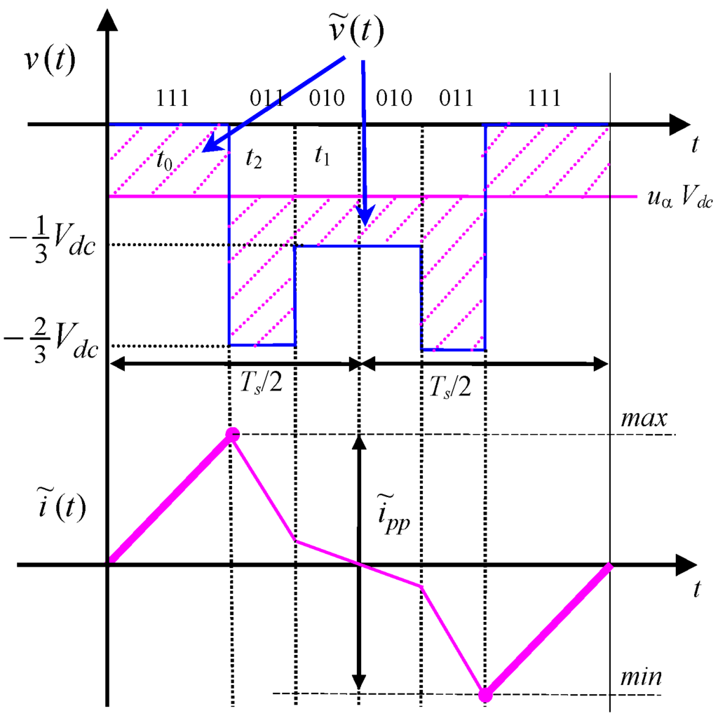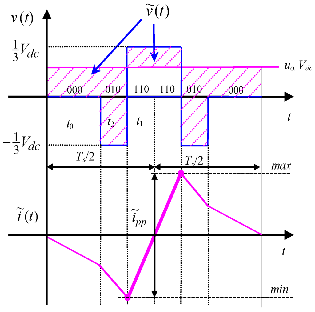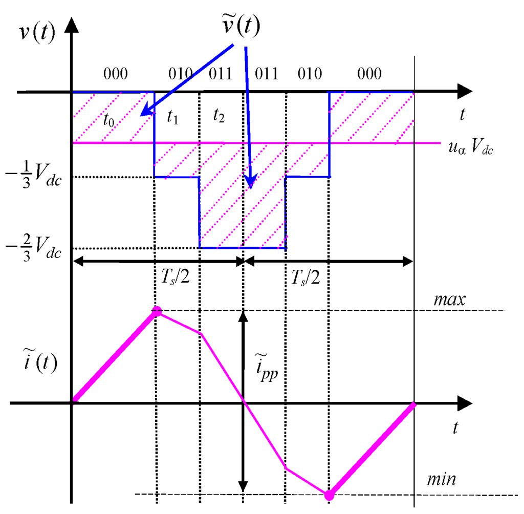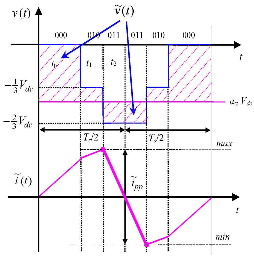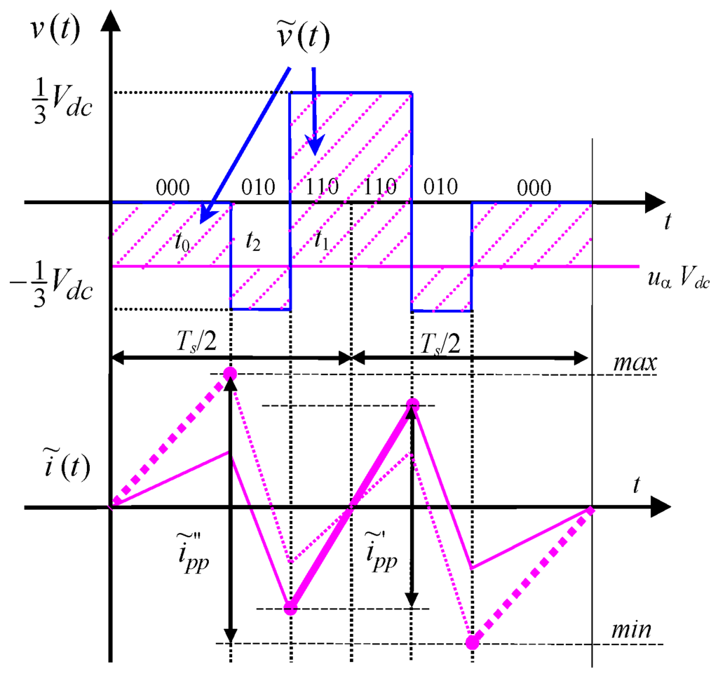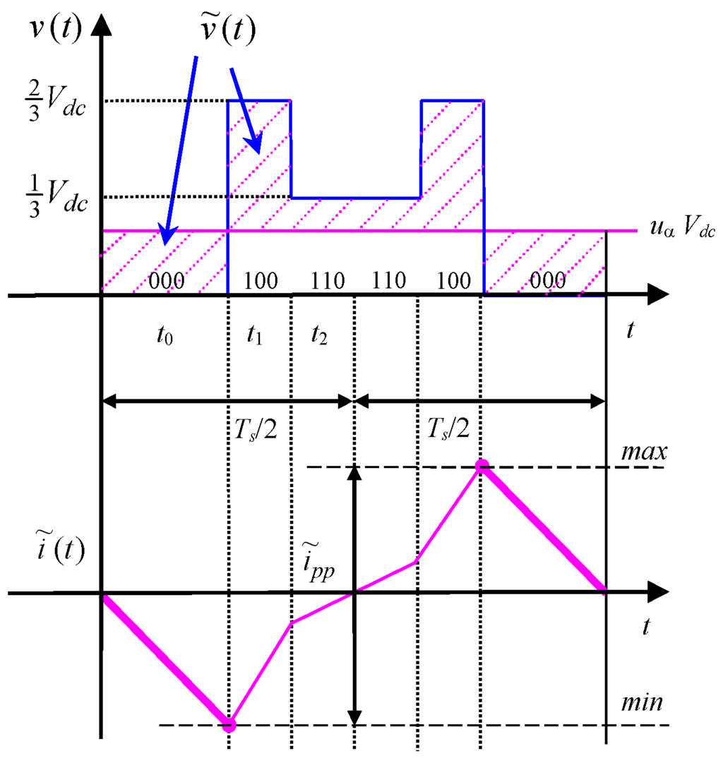 Considering a three-phase voltage source inverter either supplying an ac motor or connected to the grid by link inductors, the instantaneous current ripple can be determined for each phase according to [18,21], on the basis of the alternating voltage component :