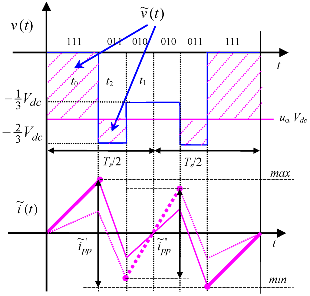 where v(t) is the instantaneous output voltage, is the average output voltage over the inverter switching period Ts, and L is either the total leakage inductance of ac motor or the link inductance towards the grid. Resistive voltage drops can usually be neglected [18,21].