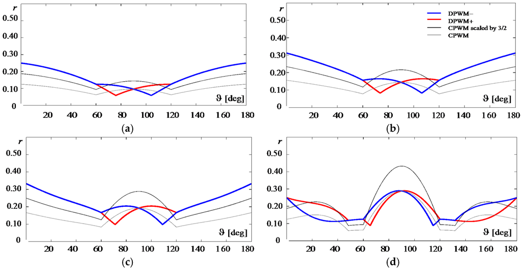 The peak-to-peak current ripple amplitude in the cases of DPWM± and CPWM is presented in Figure 15. Considering the same carrier frequency with different modulation indexes to cover the whole linear modulation range, m = 1/6, 1/4, 1/3, and 1/2. In particular, the normalized current ripple r(m,ϑ) defined by (11) is depicted, and half of the fundamental period is considered due to the half-wave symmetry. The four traces represent the cases of DPWM− (blue trace), DPWM+ (red trace) CPWM (grey trace), and CPWM scaled by 3/2 (black trace) to account for the different average switching frequency. It can be noticed that the normalized current ripple distributions for DPWM− and DPWM+ are symmetric to each other for ϑ = 90°, i.e., r−(ϑ) = r+(180°−ϑ), and r(ϑ) is symmetric to itself for ϑ = 90° in the case of CPWM (quarter-wave symmetry, as known). In general, there are intersections of r(ϑ) among the four different modulation cases, and it cannot be said that one is always better than the others. Although r(ϑ) for CPWM seems generally lower, there are wide regions in which r(ϑ) can be minimized by properly swapping between DPWM− and DPWM+ when the scaling factor 3/2 is considered to account for the same average switching frequency with CPWM.