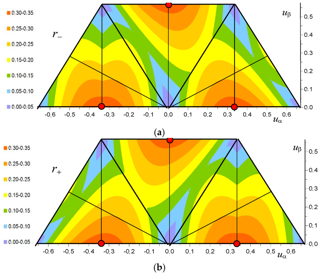 As expected, the maps show a null current ripple corresponding to the tips of the inverter voltage vectors (including the null vector), being the output voltage perfectly corresponding to the reference voltage, with a null alternating voltage. The max of the normalized current ripple is about 0.34, emphasized with red dots in the maps of Figure 16, and corresponding to the points farther from the inverter voltage tips, i.e., rmax(uα, uβ) = r(−1/3, 0) ≈ r(0, 1/√3) ≈ r(1/3, 0) ≈ 0.34. In terms of modulation index and phase angle, positions of the maximum become: rmax(m, ϑ) = r(1/3, 180°) ≈ r(1/√3, 90°) ≈ r(1/3, 0°) ≈ 0.34.