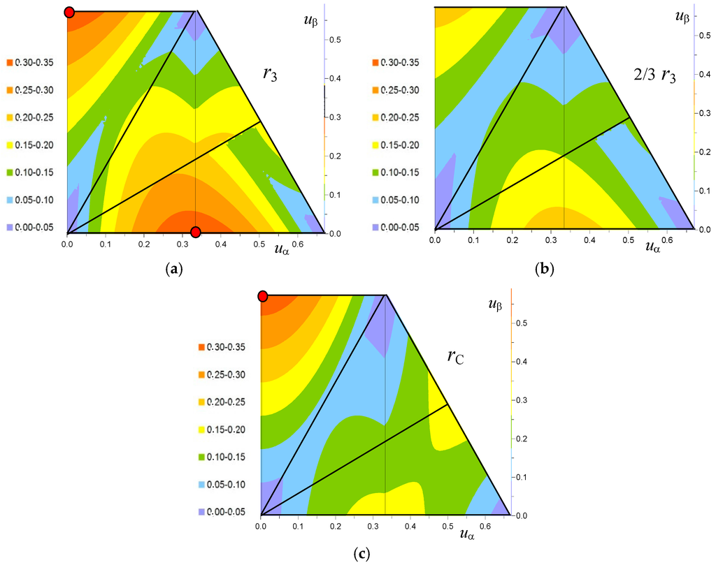 Once the superiority of DPWM3 is established among the DPWMs, it should be compared with CPWM that is considered the optimal modulation techniques among all PWMs [4], also accounting for the different average switching frequency. For this purpose, Figure 17 shows three colored maps of the normalized current ripple r(uα, uβ) in the 1st quadrant for DPWM3 (Figure 17a), DPWM3 scaled by 2/3 (Figure 17b), and CPWM (Figure 17c). Whereas the superiority of CPWM is evident comparing to the unscaled current ripple for DPWM3, DPWM3 becomes better than CPWM if the scaling by 2/3 is considered for the current ripple. In particular, it is well visible that the two regions appearing red (normalized ripple 0.3–0.35) in Figure 17a turn to orange (normalized ripple 0.2–0.25) in Figure 17b, leading to two normalized current ripple maxima around 0.22, comparing to the single maximum around 0.34 (red dot in Figure 17c) in case of CPWM.