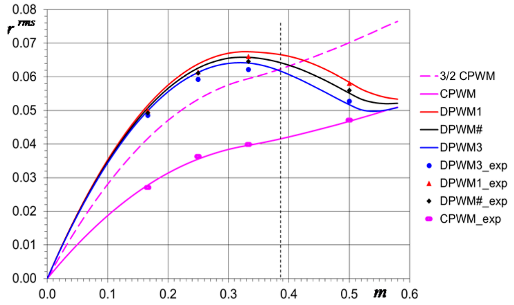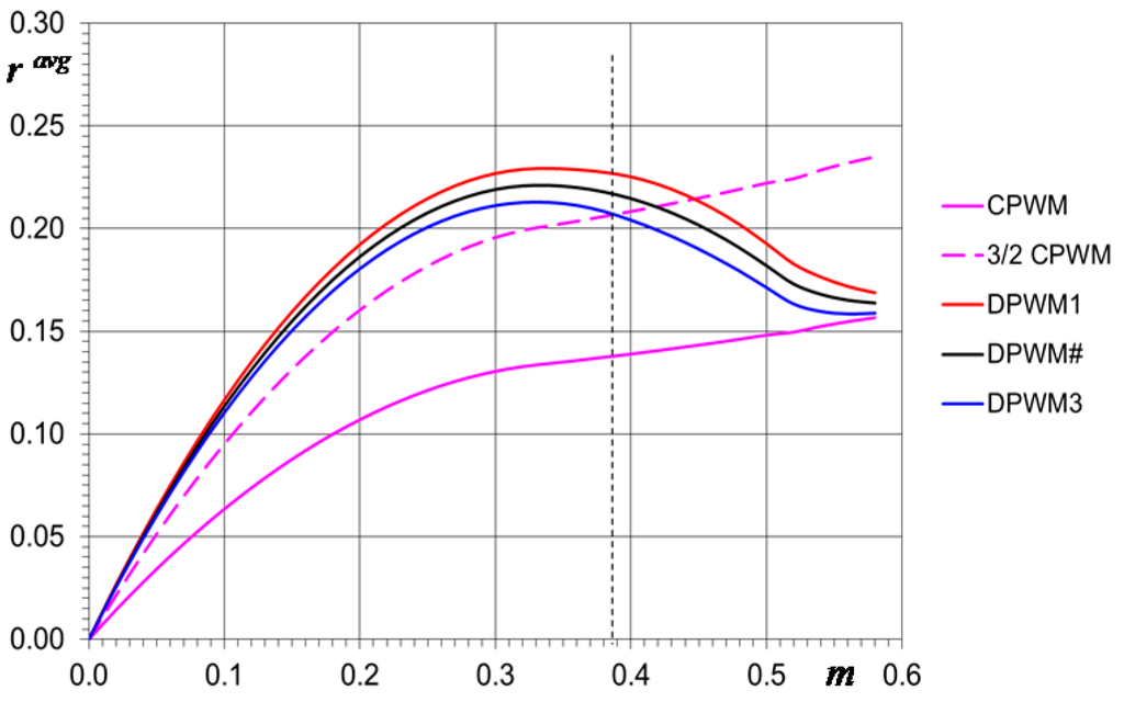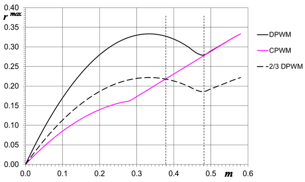 The normalized current ripple rms calculated according to Equation (51) in case of CPWM and DPWMs are shown in Figure 21, confirming the superiority of DPWMs comparing to CPWM for high modulation indexes, also in terms of current ripple rms. The simplified rms calculation presented in Figure 21 can be compared with the corresponding diagrams existing in literature, and in particular considering Figure 13 in [3], Figure 6 in [5], Figure 7 in [10], and Figure 10 in [6], showing a satisfactory matching.