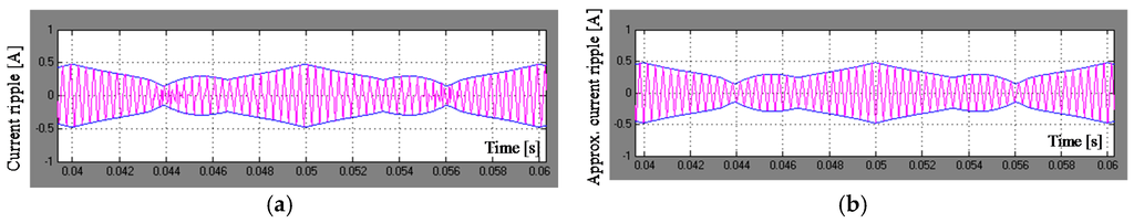 An example is given in Figure 20: Figure 20a shows the instantaneous current ripple (simulated) with its envelope, as determined in Section 3. Figure 20b shows a triangular waveform modulated by the same envelope of Figure 20a. This example has been carried out by a Matlab-Simulink simulation considering Vdc = 300 V, fs = 1/Ts = 3 kHz, m = 1/3, f = 1/T = 50 Hz, 3-phase VSI, passive load R = 10 Ω, L = 18 mH, in the case of DPWM+. In this case, the rms of the instantaneous current ripple results in 0.1878 A, whereas the rms of the modulated triangular waveform is 0.1896 A, with a mismatch lower than 1%. It has been verified by numerical simulations that the rms estimation error is always in the order of few % for all the modulation techniques, over the whole modulation range. In general, this method overestimates the current ripple rms, since the real peak-to-peak current behavior is approximated by straight lines (triangular waveform), corresponding to two output voltage levels instead of three.