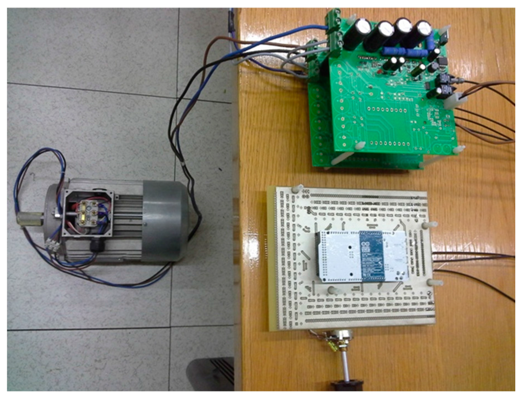 Experimental setup: Induction motor (left) supplied by three-phase inverter (top) and microcontroller board (bottom).