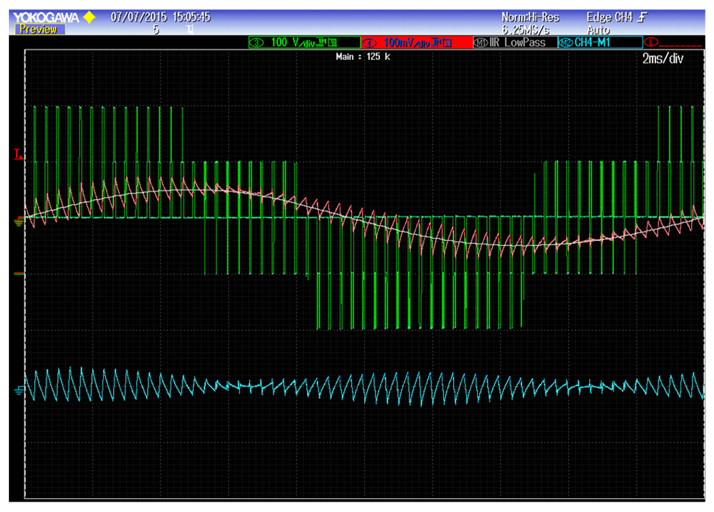 Finally, the simplified method proposed in Section 4.4. for evaluating the current ripple rms on the basis of the ripple envelope has been experimentally verified in all cases of CPWM and DPWMs techniques, for different modulation indexes. In particular, the experimental current ripple rms calculated by the scope (rms of the blue trace in Figure 23) are presented with dots in the previous Figure 21, corresponding to m = 1/6, 1/4, 1/3 and 1/2. Matching with the values approximated by Equation (51) is generally good, with a resolution in the order of few percent, confirming the effectiveness of the simplified proposed method.