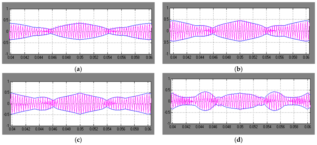 The three-phase inverter has been supplied by the dc-link voltage Vdc = 300 V. The switching frequency has been set to fs = 1/Ts = 3 kHz and the fundamental frequency has been kept at f = 1/T = 50 Hz for easier comparison with analytical developments. A relatively low switching frequency has been chosen in order to keep the current ripple clearly visible within a fundamental period. The Yokogawa DLM2024 oscilloscope (Yokogawa Electric Corporation, Tokyo, Japan), with the PICO TA057 differential voltage probe (Tyler, TX, USA) and LEM PR30 current probe (LEM Europe GmbH, Fribourg, Switzerland), has been used for all measurements. The current ripple has been estimated using the oscilloscope’s mathematical functions by subtracting the fundamental current component from the instantaneous current (as for the blue trace in Figure 23), and it has been uploaded in the workspace of Matlab to be compared to the theoretical ripple envelopes.