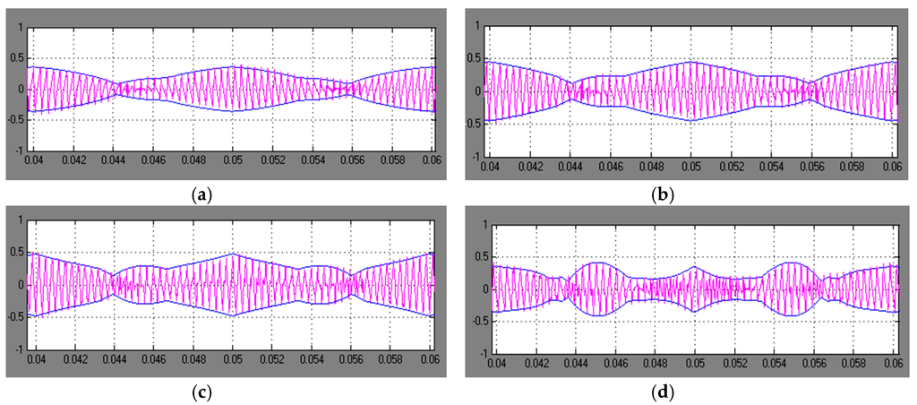 Experimental current ripple and theoretical envelope in the case of DPWM− for: (a) m = 1/6; (b) m = 1/4; (c) m = 1/3; and (d) m = 1/2.